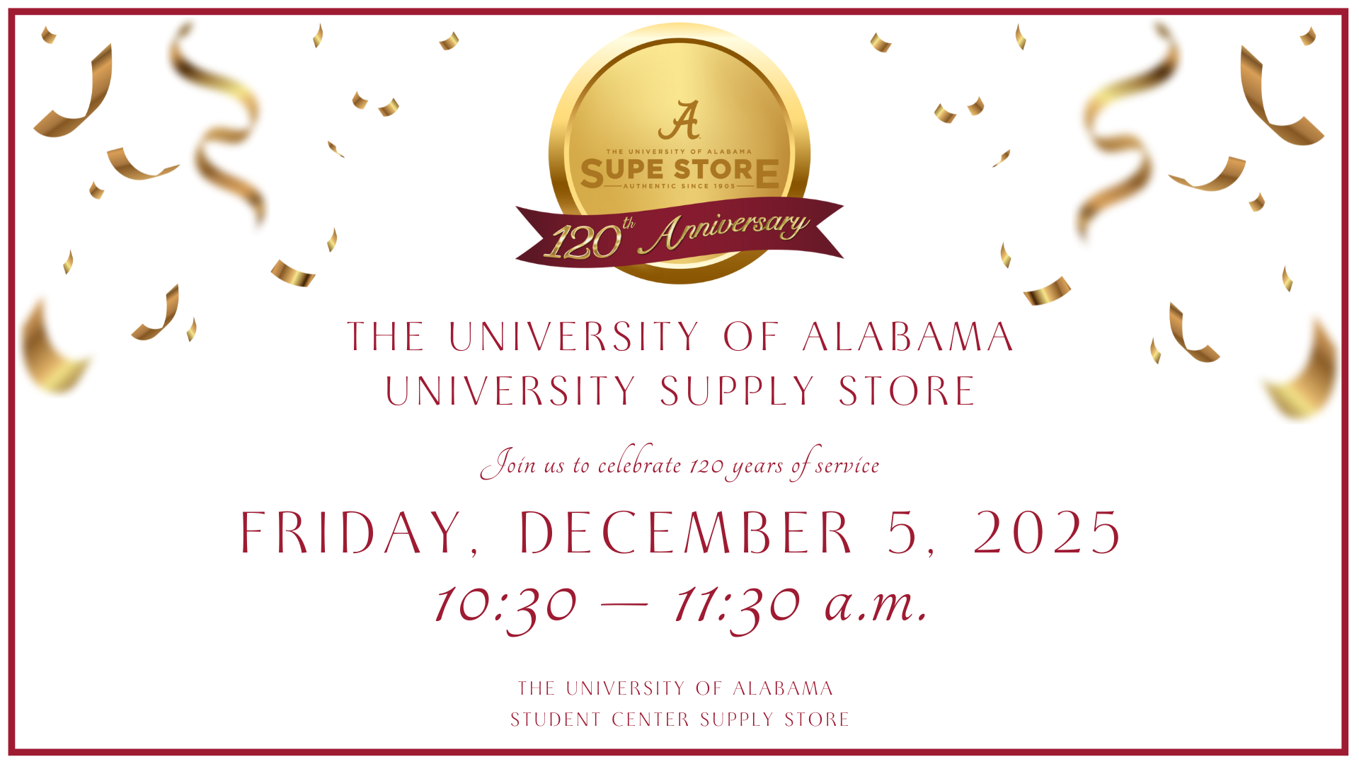University Supply StoreJoin The University of Alabama Supply Store Dec. 5 from 10:30-11:30 a.m. at the Student Center Supply Store location to celebrate 120 years of service.